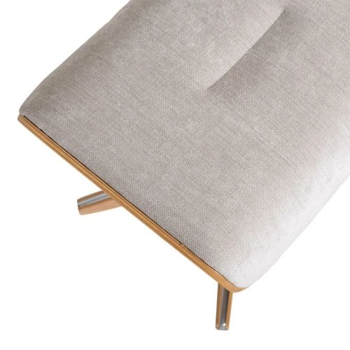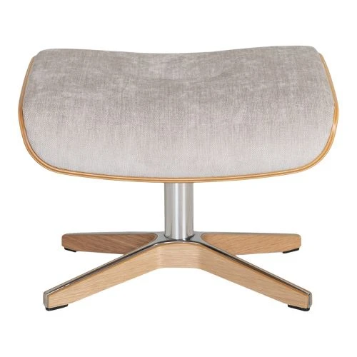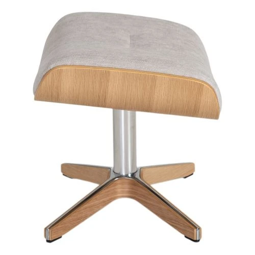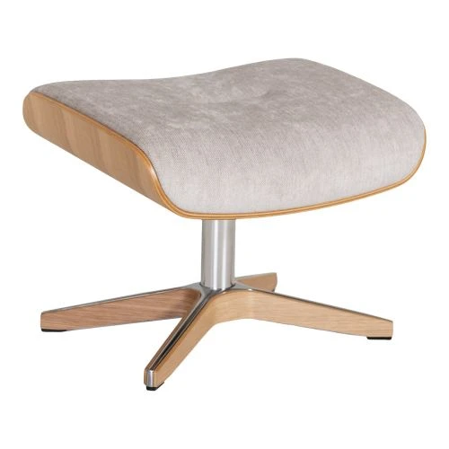 Air fotpall är tillverkad i B-tyg Evita sand färg nummer 1373-06 med lacakd ekfanér på sidorna och en kryssfot i aluminium som är klädd i lackad ekfanér.