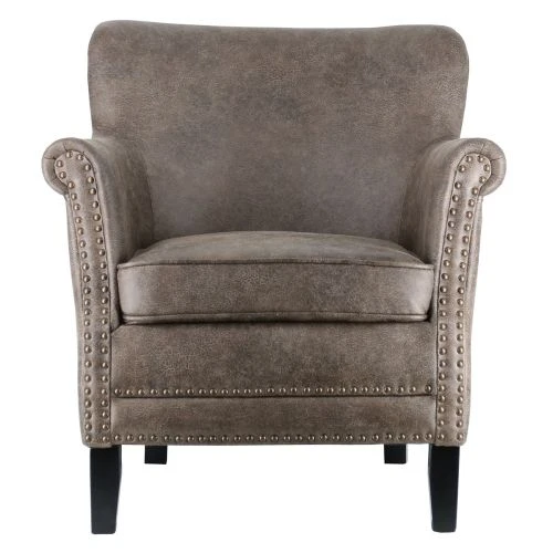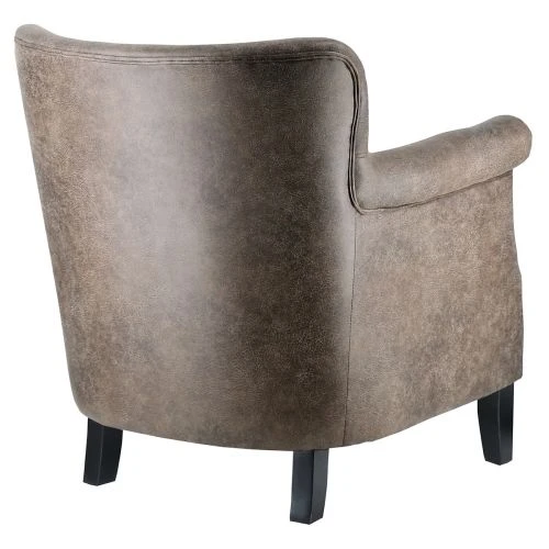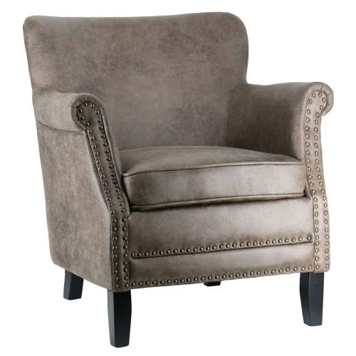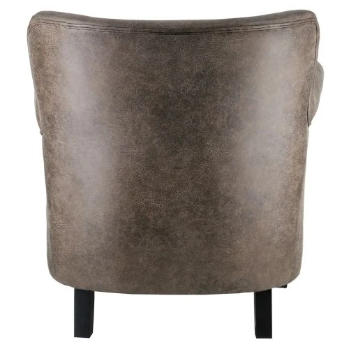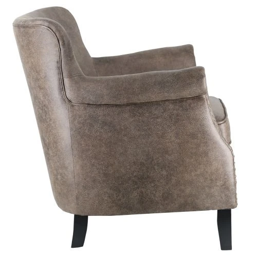 Baron är en fåtölj i vintagestil, här i brunt tyg i antiklook som påminner om mocka i strukturen. Fåtöljen har svarta ben i gummiträ och dekorativa nitar.