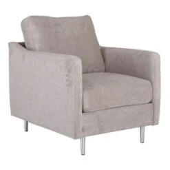 Fåtölj i gråbeige tyg med lös ryggkudde och konade ben i silverfärgad metall. Komplettera gärna med Bornholm fotpall för extra komfort och hemtrevnad.