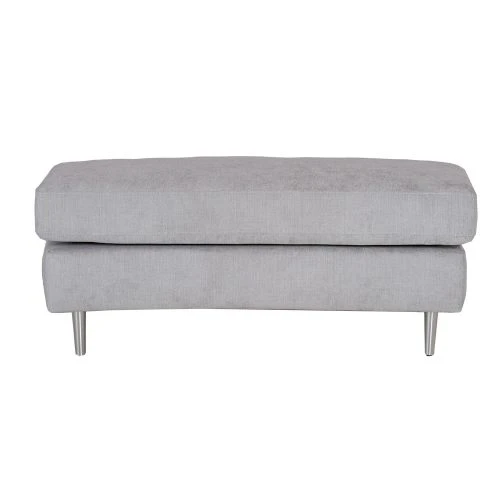 En svängd fotpall i grått tyg med konade ben i silverfärgad metall. Extra fin tillsammans med Bornholm soffa.