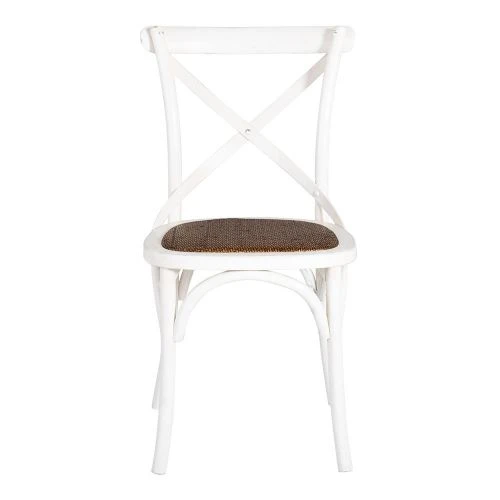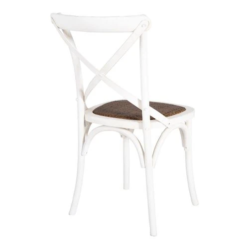Bretagne är en serie möbler i rustik stil med en touch av vintage. Här som matstol i vitt trä med ryggkryss och sits i naturfärgad, flätad rotting.