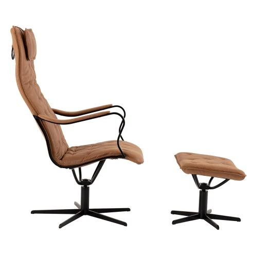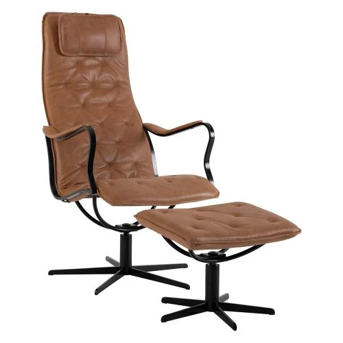 Chic fåtölj med pall och nackkudde i skinn vintage cognac med underrede och kryssfot i svart metall. Fåtöljen har en rörstomme med nozag med överdrag av polyeter. Fåtöljen har även en gungfunktion för optimal komfort.