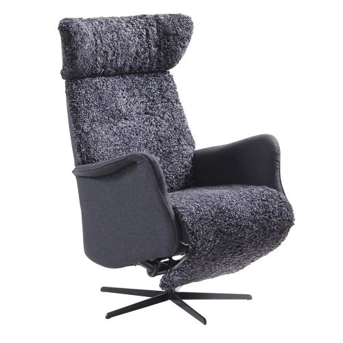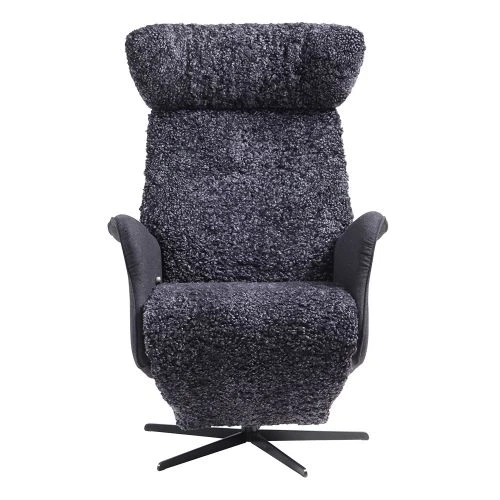 Cruze fåtölj med inbyggd fotpall i fårskinn grå med baksida och armstöd i tyg Facet färg 4 mörkgrå. Ryggen och nackstödet är ställbart för bästa komfort. Cruze har en snurrfot i metall. Sits och rygg är i formgjuten kallskum 50 kg.