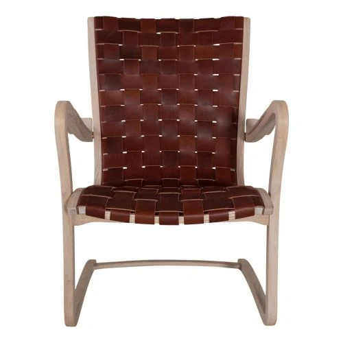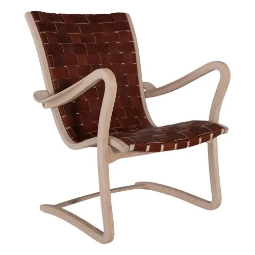 Sviktfåtöljen Drängen är tillverkad med en stomme i massivt böjträ, vitpigmenterad ek. Flätad sits och rygg i Tärnsjö remläder färg Cognac 9666. Drängen har inbyggd svikt för sköna stunder och fåtöljen är designad av radikale funktionalisten G.A Berg.