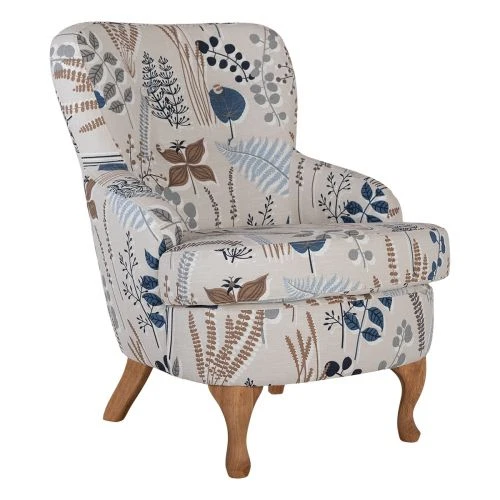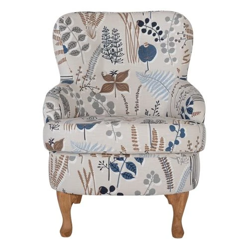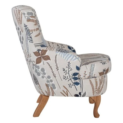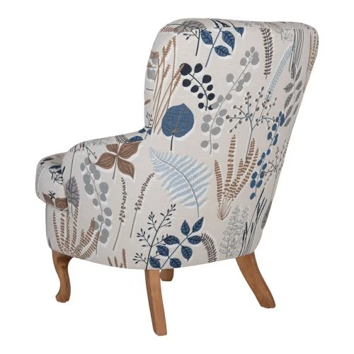 Elin fåtölj är tillverkad i ett 5-tyg Botanik 03 blå med ben i oljad ek. Pallens mått är 42 cm hög, 38 cm djup och 52 cm bred. Benen är 17,5 cm höga på både fåölj och pall.