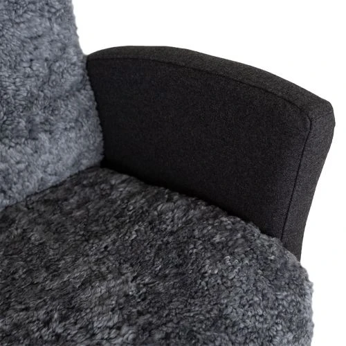 Enzo fåtölj i fårskinn grey med stomme i 2-tyg Facet 4 mörkgrå med nackkudde i svart läder från Skinnwille. Benställning i oljad ek. Sitsen är av formgjuten 50 kg kallskum med ett svep av 200 grams polyesterfiber. Ryggen är av formgjuten 50 kg kallskum med ett svep av 200 grams polyesterfiber.