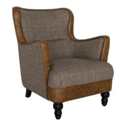 Errol är en fåtölj i klassiskt utförande med många detaljer. Fåtöljen är klädd i ett melerat Harris Tweed-tyg som är ett 100% ulltyg tillverkat i Storbritannien med detaljer i brunt anilinläder Cerato standard i färgen brown. Insidan av armstöden och upp i ryggen är klädd med nitar Baroc 02.