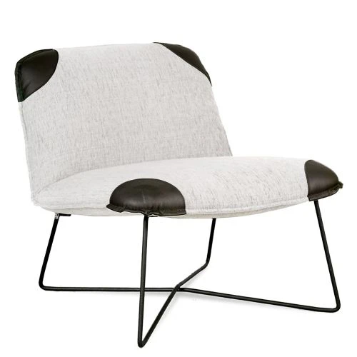 Fly fåtölj med benställning i svart metall och sits i grått tyg med läderdetaljer i svart.