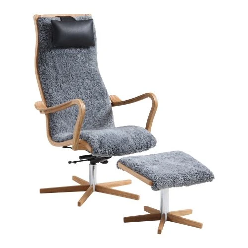 Furiren fåtölj har utsökt komfort trots sin smäckra form. Fårskinn grey och stommetyg linneväv natur, nackkudde i svart läder Classic 009 Skinnwillw. Fåtöljen har extra stoppning i rygg och sits. Klassiska träarmstöd och gungmekanism. Fotpallens mått är 50 cm bred, 45 cm djup och 30-38 cm hög.
