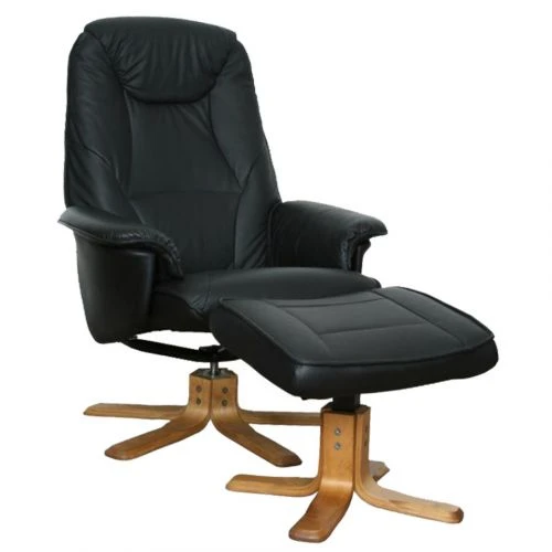 Skön snurrfåtölj i svart skinn. På slitytor, baksida på rygg och armstöd är fåtöljen i konstläder. Fåtöljen har en tillhörande fotpall. Stomme i ek. Kallskum och nozagfjädrar i sitsen för bästa hållbarhet. Relaxfunktion där man fäller ryggen bakåt till önskat läge. Fotpallens mått är 51 cm bred, 41 cm djup och 42 cm hög.