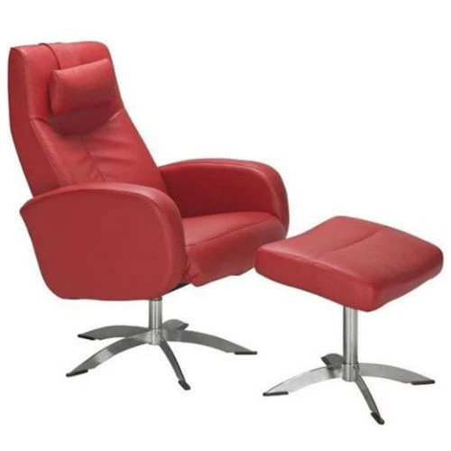 En klassisk snurrfåtölj med pall i modern design. Skön snurrfåtölj i rött skinn och konstläder färg 215 med fot A-1krom och tillhörande fotpall. Kallskum och nozagfjädrar i sitsen för bästa hållbarhet. Relaxfunktion där man fäller ryggen bakåt till önskat läge. Fotpallens mått är 60 cm bred, 43 cm djup och 44 cm hög.