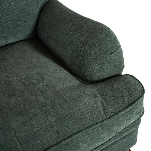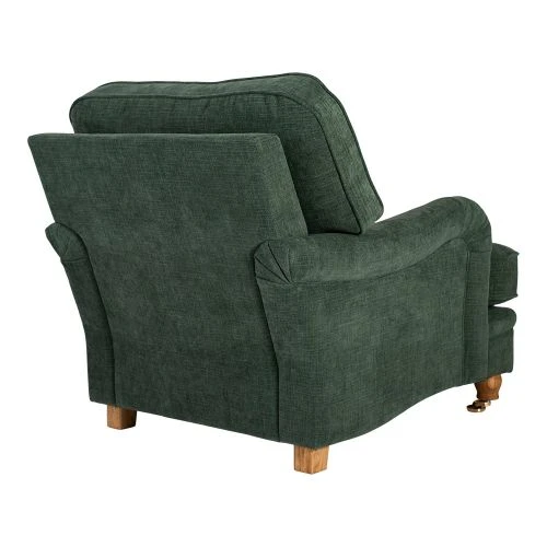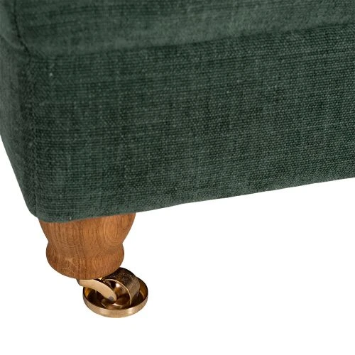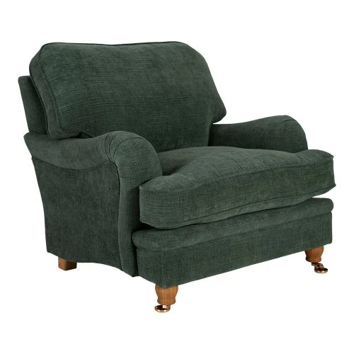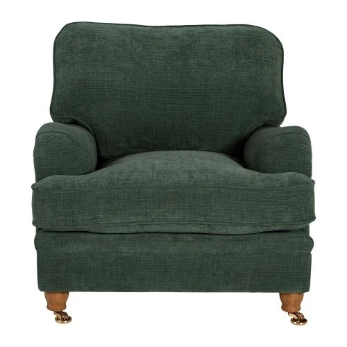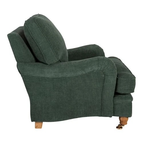 En klassisk howardfåtölj från Burhéns. Här i tyg med mycket struktur i en härlig grön nyans och ben i oljad ek. Fåtöljens främre ben är försedda med hjul i mässing, som låses med hjälp av medföljande hjulkoppar. Kombinera med en soffa i samma modell för en genomgående och enhetlig känsla.