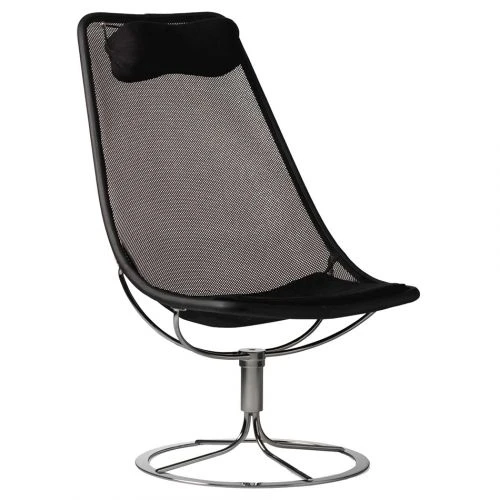 Jetson 66 med kort dyna, sits i bärande nät med detaljer i svart läder och förkromat underrede. Jetson är en milstolpe i Bruno Mathssons produktionsprogram och har fått många efterföljare. Skålformad sits och hög ergonomiskt utformad rygg med nackkudde. Stativ med ett unikt minne, där stolen roterar tillbaka till sin ursprungliga position.