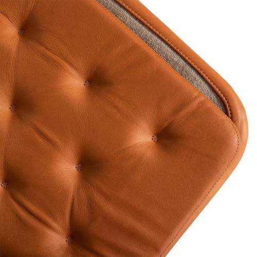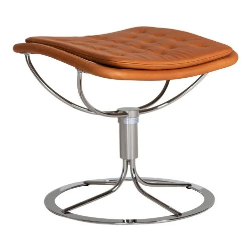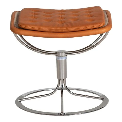 Jetson 69 fotpall i konjaksfärgat läder. Bärande linneväv natur med skoning och dyna i Dakota 24 konjak. Jetson är en milstolpe i Bruno Mathssons produktionsprogram och har fått många efterföljare. Skålformad sits och hög ergonomiskt utformad rygg med nackkudde. Stativ med ett unikt minne, där stolen roterar tillbaka till sin ursprungliga position.