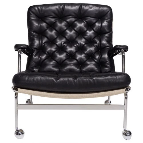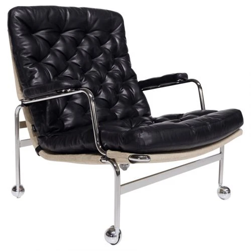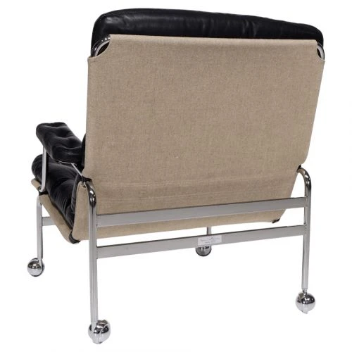 Bruno Mathssons utveckling av den klassiska och eleganta Karin från 1969 i svart läder Dakota färg 88 med linneväv Flax och kromat underrede med hjul.1973 års version har en djup kudde bak, men är i övrigt identisk med Karin från 1969.
