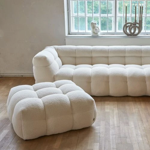 Kendall är en serie trendiga soffor och fåtöljer med influenser från flera olika tidlösa designklassiker. Här i form av fotpall i naturvitt teddytyg. Den bulliga formen och de låga benen är två karaktäristiska detaljer som gör att Kendall direkt hamnar i blickfånget och blir rummets naturliga mittpunkt. Fotpallen är extra snygg ensam tillsammans med soffan och fåtöljen från samma serie.