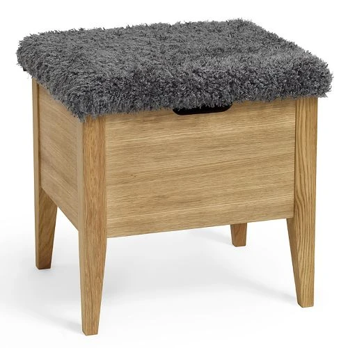 Klinte är en serie möbler från Torkelson. Här är Klinte bänk i oljad ek MDF, och lådsidor i plywood. Bänken är 45 cm bred. Här med grå fårpälsimitationsklädsel. Kombinera gärna med möbler från samma serie för en enhetlig look.