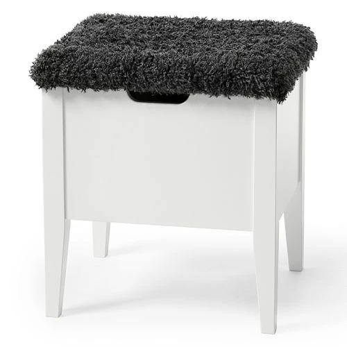 Vitlackad bänk med grå fårskinnsimitation och förvaring under sitsen. Klinte är en serie smarta möbler med genomtänkt design som underlättar vardagen.