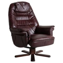Lotus är en prisvärd, svensktillverkad fåtölj från Möbelform, här i läder/konstläder i den vinröda nyansen antik oxblod. Fåtöljen har kryssfot i mahognybetsat trä. Nackkudden, de bekväma armstöden och den steglöst fällbara ryggen bidrar till fåtöljens komfort. Fåtöljen kommer med praktisk snurrfunktion. Komplettera gärna med fotpallen Lotus i samma utförande för extra hög komfort.