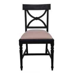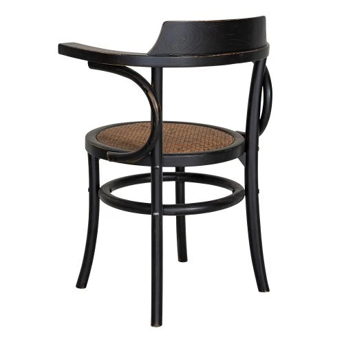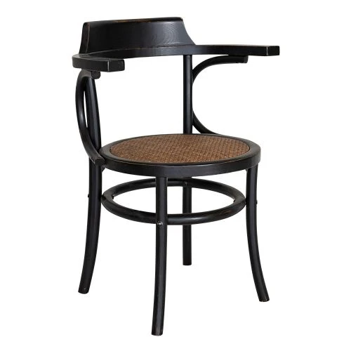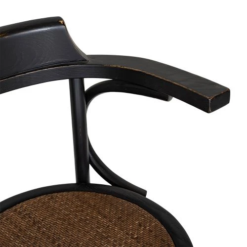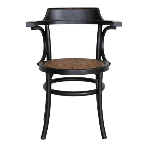 Metz är en snygg karmstol med en touch av vintage, med rundade armstöd och rund sits. Här med stomme i svart trä och sits i flätad rotting i naturfärg.