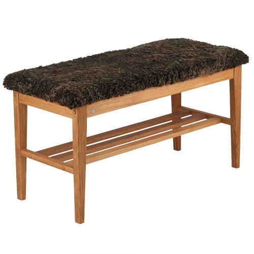 Nadja är en vacker och praktisk bänk från Oscarssons Möbel, här i oljad ek med fårskinnsdyna i brunt fårskinn. Bänken har en underhylla som rymmer smått och gott. Kombinera med fördel bänken med fler delar från serien Nadja för en enhetlig stil.