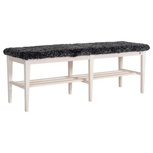 Nadja är en vacker och praktisk bänk från Oscarssons Möbel, här i vitoljad ask med fårskinnsdyna i mörkgrått fårskinn. Bänken har en underhylla som rymmer smått och gott. Kombinera med fördel bänken med fler delar från serien Nadja för en enhetlig stil.