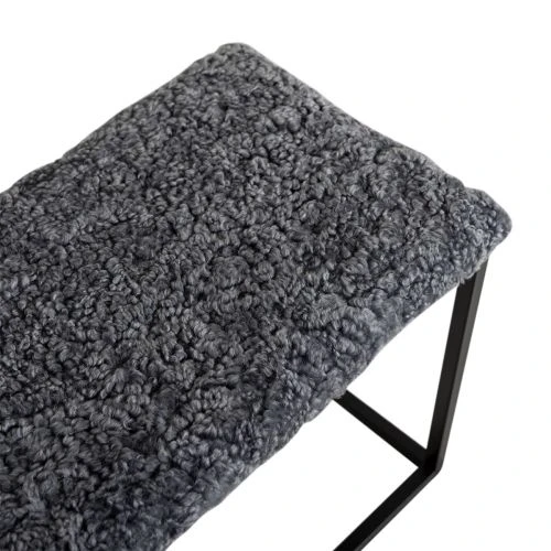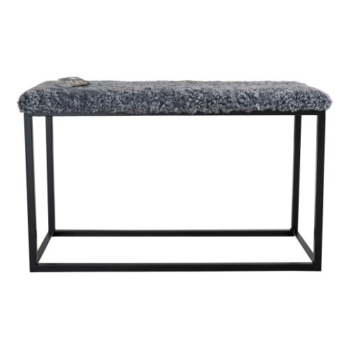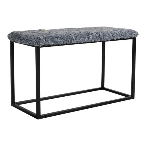 Palle är en stilren, klassisk bänk med ställning i svart metall och sits i grått fårskinn. Använd den i hallen, som extra sittplats eller snygg inredningsdetalj.