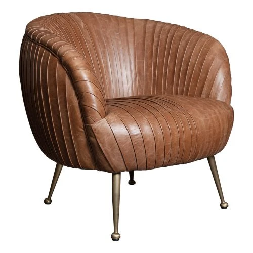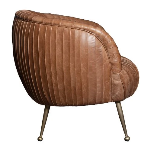 Perugia är en unik fåtölj med veckad/plisserad klädsel i brunt läder. Fåtöljen har tunna, snedställda ben i guldfärgat stål.