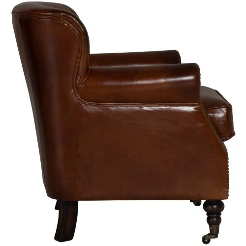 Fåtölj med den rätta vintagekänslan. Professor vintage fåtölj i Newark darkbrown skinn med raka, bruna ben bak och runda, svarvade ben fram. Benen framtill är försedda med hjul för att fåtöljen enkelt ska kunna förflyttas. Framtill på armstöden är nitar ditspikade. Fåtöljen är liten och nätt med runda kanter och rundade armstöd för ett mjukt intryck.