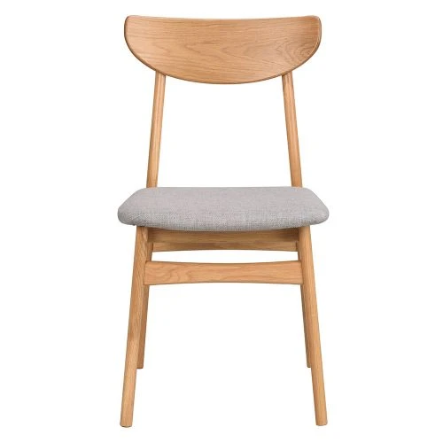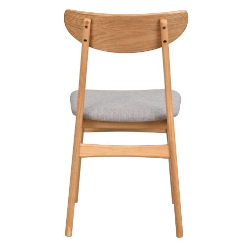 Rodham stol är tillverkad i massiv lackad ek med en sits i plywood och ett ljusgrått polyestertyg. Svarvade ben och rundad rygg bjuder in till en skön stund framför matbordet.