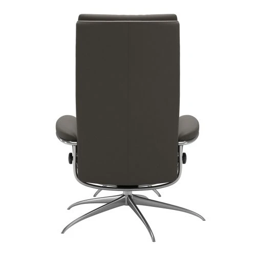 Tokyo fåtölj och pall i läder Paloma färg metal grey nummer 16 med rund kryssfot star. Smal rygg, vadderad dyna och justerbar nackkudde. Ryggstödet lutar sig bekvämt efter dina rörelser.Stolen går att justera enkelt med en spak. Det sitter en ”ratt” på sidan av stolen som gör att du kan ställa in det glidmotstånd som passar dig bäst. Fotpallens mått är 54 cm bred, 46 cm djup och 50 cm hög.