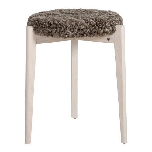 Vinz är en klassisk, stapelbar pall i vitoljad ask med dyna i ljusbrunt fårskinn. Pallen passar bra i hallen eller som extra sittplats.